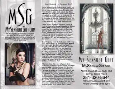 Boudoir portraiture, Nude photography, and sexy photography by experienced husband & wife team Nolan & Lucinda Conley of Spring (North Houston) will produce a gift you will be proud to gift to your special someone. This intimate photography website is designed for women wanting to give the very special gift of sexy personal portraiture to themselves or the person they love! My Sensual Gift is a woman - owned company by Lucinda Conley.